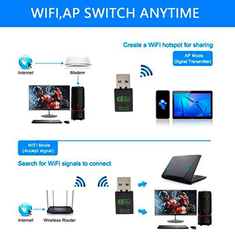Adaptador Bluetooth 4.2 + Wifi 5GHz e 2.4GHz USB, tenha rede sem fio no seu computador ou notebook, com Bluetooth para parear fones de ouvido, controles de vídeo game, impressoras e muito mais, tudo isto em um único dispositivo.