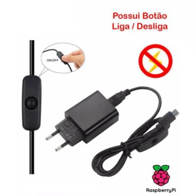 FONTE ESPECIFICA RASPBERRY Pi3 DE 5V COM BOTÃO LIGA/DESLIGA.