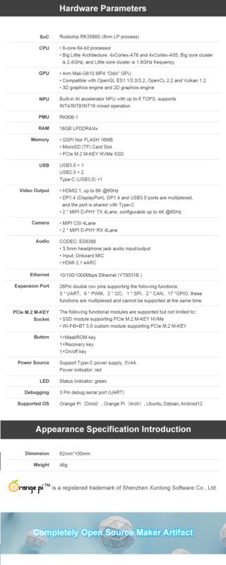 A Orange Pi 5 usa o processador Rockchip RK3588S de 8 núcleos e 64 bits de nova geração, quad-core A76 + quad-core A55, com design de processo de 8 nm, frequência principal de até 2,4 GHz, GPU ARM Mali-G610 integrada, 3D de alto desempenho incorporado Módulo de aceleração de imagem /2D, NPU integrado com poder de computação 6Tops, com 4 GB/8 GB/16 GB/32 GB (LPDDR4/4x) e capacidade de processamento de exibição de até 8K.